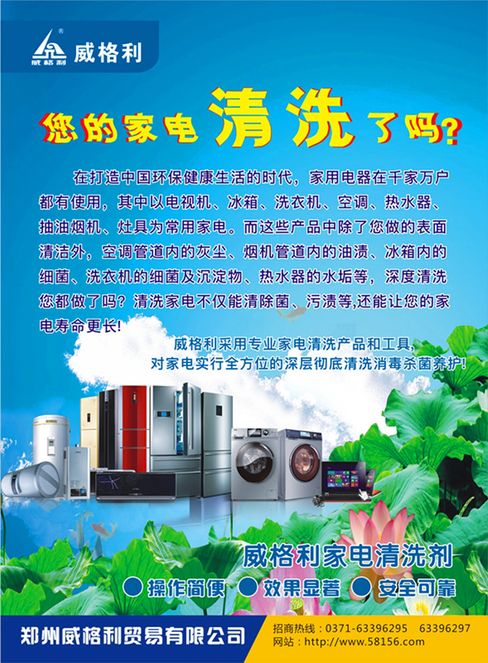 完善的商標(biāo)可以充分的*我們威格利家電清洗品牌的商譽(yù)不受侵害,這也是我們公司對眾多的加盟商的一個(gè)支持和保障!威格利---洗出健康好電器!